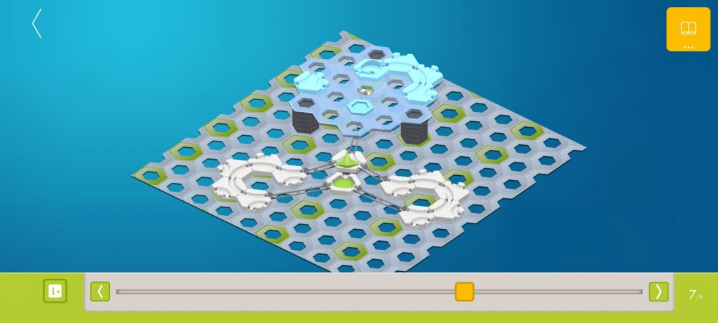 Playing with GraviTrax necessitates a high level of debugging. Whether trying to copy one of the example track designs, or building your own, there will be many moments where the marbles do not do what you planned them to. Perhaps there was an issue with setup, or a fault with the design, or just plain physics. In this case, there will be tweaking required, and many many restarts. Even when you copy one of the tracks from the book, you might see a way in which to improve the track design so the marbles flow more smoothly or faster. For example, I made one of the more advanced tracks and found that towards the end of the track, one of the marbles would lose momentum and fail to reach the end point. I adjusted the height of one of the pieces to give the marble a tiny bit more speed to ensure it would be able to get to the end consistently.
